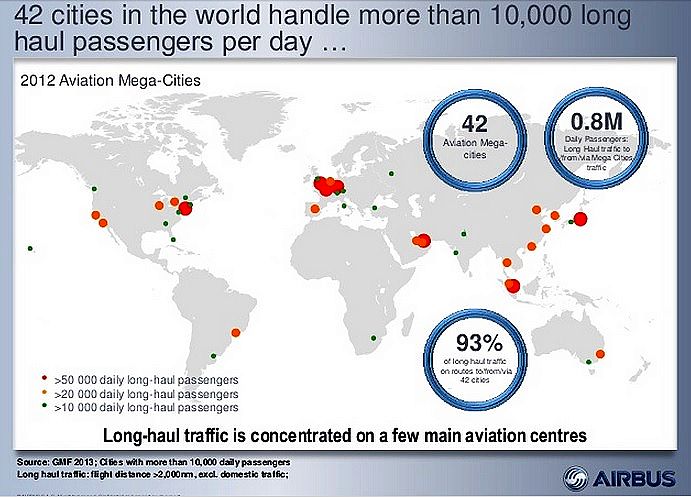 | Pacomartin Member since: Oct 24, 2012 Threads: 1068 Posts: 12569 | Airbus defines an Aviation Mega City as a city with more than 10,000 daily international passengers who fly more than 2000 nautical miles. It's obviously a definition to help them make the case for the A380 (which is primarily used on long haul international flights). Denver is excluded from the top 7 US airports because it doesn't have that much international traffic. But the definition includes 3 airports in Latin America (BOG, EZE and GRU), 3 in Canada (YMQ, YTO , YVR), 11 in the USA, and 1 in Africa. All total there are 55 such airports in the world. Airbus is trying to convince people that no matter how many long thin routes get developed that massive movement of people from hub to hub will still dominate international air traffic. Hence the need for very large aircraft. The argument has been going on for a decade, but they still don't sell a lot of planes. AMS ATL AUH BJS BKK BOG BOM BOS BRU BUE CAN CHI DEL DFW DOH DPS DUB DXB FRA HKG HNL HOU IST JED JKT JNB KUL LAX LIS LON MAD MAN MEL MIA MIL MNL MOW MUC NYC OSA PAR ROM SAO SEL SFO SHA SIN SYD TPE TYO WAS YMQ YTO YVR ZRH Definition does not include Mexico City where most international flights are under 2000 nm. It does not have 10,000 daily passengers to Europe, Asia, Peru, Chile, Brazil, and Argentina . Bogota is included while Mexico City is not. But Bogota is more than 2000 nm from DFW, Chicago, Washington DC, Rio de Janeiro, Santiago Chile, and Sao Paulo while Mexico City is closer to many of the USA cities. |