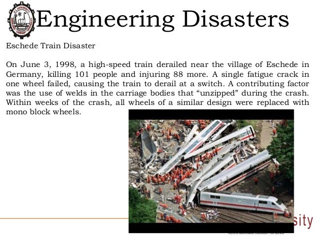 The Eschede disaster was caused by a single wheel. a total of 56% of the seats were empty. The fatality rate was 34% with another 30% severely injured. The train was travelling at only 125 miles per hour (about the top speed of the Amtrak trains in the Northeast USA). Passengers: 287 (ICE-1 max. is 651) Train crew: 6 Maintenance crew: 2 Fatalities: 101 Severe injuries: 88 Minor or no injury: 106 ![]() The tyre embedded in the rail car was seen by Jörg Dittmann, one of the passengers in Coach 1. The tyre went through an armrest in his compartment, between where his wife and son sat. Dittmann took his wife and son out of the damaged coach and went to inform a conductor in the third coach. The conductor, who noticed vibrations in the train, told Dittmann that company policy required him to investigate the circumstances before pulling the emergency brake. The conductor took one minute to go to the site in Coach 1. According to Dittmann, the train had begun to sway from side to side by then. The conductor did not show a willingness to stop the train immediately at that point and wished to investigate the incident more thoroughly. Dittmann could not find an emergency brake in the corridor and had not noticed that there was an emergency brake handle in his own compartment. The crash occurred just when Dittmann was about to show the armrest puncture to the conductor. If the passenger had pulled the emergency brake himself it is possible that no one would have died. Neither he nor the conductor were held legally responsible for failing to act. Seconds from Disaster is a one hour documentary. I have seen this documentary several times, and it is a horrific series of events, each one compounding the situation as it goes from worse to worse. |
