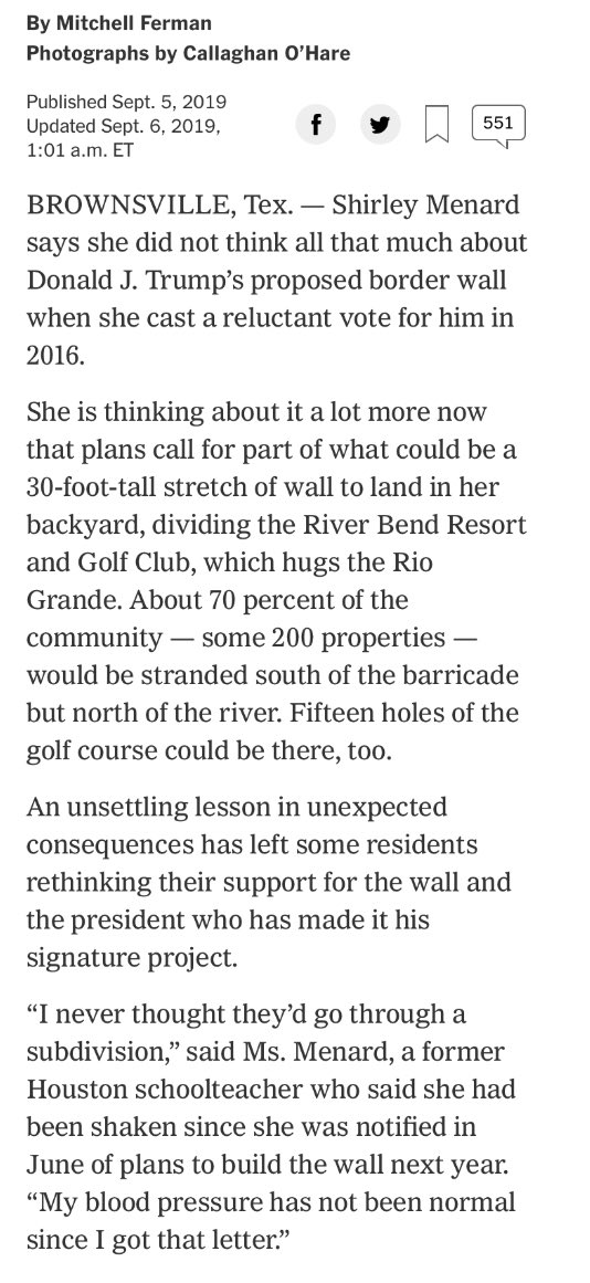| reno Member since: Oct 24, 2012 Threads: 59 Posts: 1388 | From the New York Times: Some retired Trump voters in Texas are upset because Trump's wall will cut their neighborhood in half and their United States houses will be on the Mexico side of the wall. |