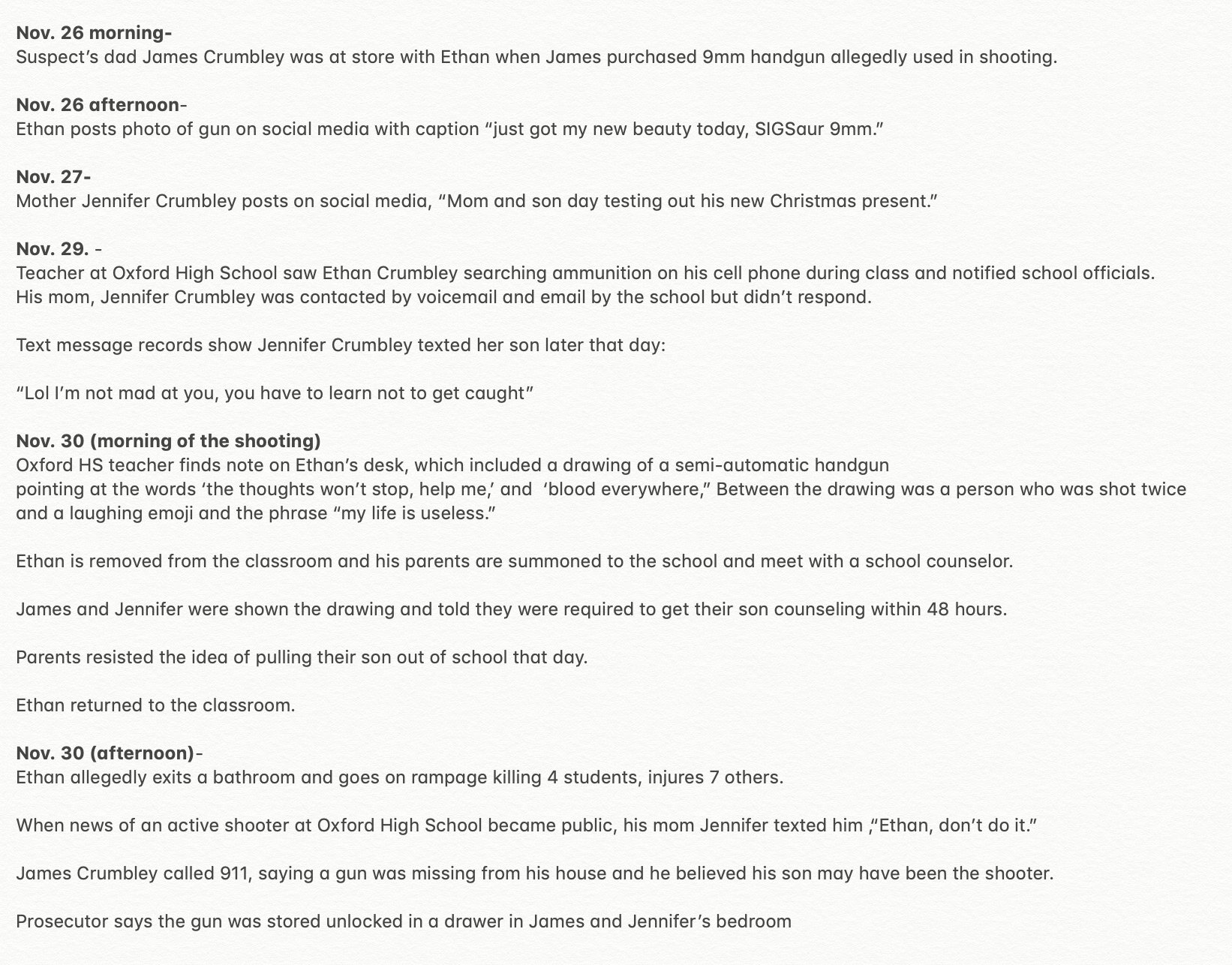 | missedhervee Member since: Apr 23, 2021 Threads: 159 Posts: 5477 | article Will the parents of the shooter become a new cause celebre for the gun-loving right wingers? By report the lad's doting parents bought a pistol for him to use, mama and he shot it to get used to it, and it continues (see article). So should the parents be found guilty or not, and why or why not? |