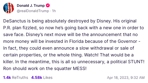 Most absurd Governor ever He's obsessed with punishing Disney Why??????????????????????? Will Desantis cheerleader Soopoo tell us why? Its illogical, dumb and anti business Sometimes we live no particular way but our own - Grateful Dead "Eyes of the World" |