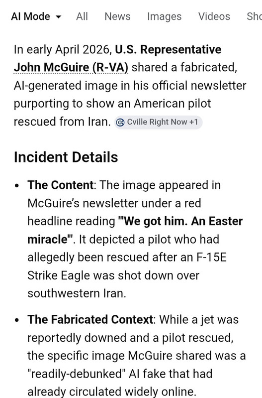 | terapined1 Member since: Nov 26, 2024 Threads: 2 Posts: 717 | Not sure what to believe There is a lot of chatter on reddit that the rescue operation was fake A congressman actually posted fake photo of the rescued pilot There is a lot of reddit chatter that this was a failed operation to grab the Uranium Not sure what to believe Is this why Hegseth illegally banned reporters from the Pentagon? ![]() ![]() https://www.cnn.com/2026/04/09/politics/pentagon-press-policy-judge?cid=android_app |