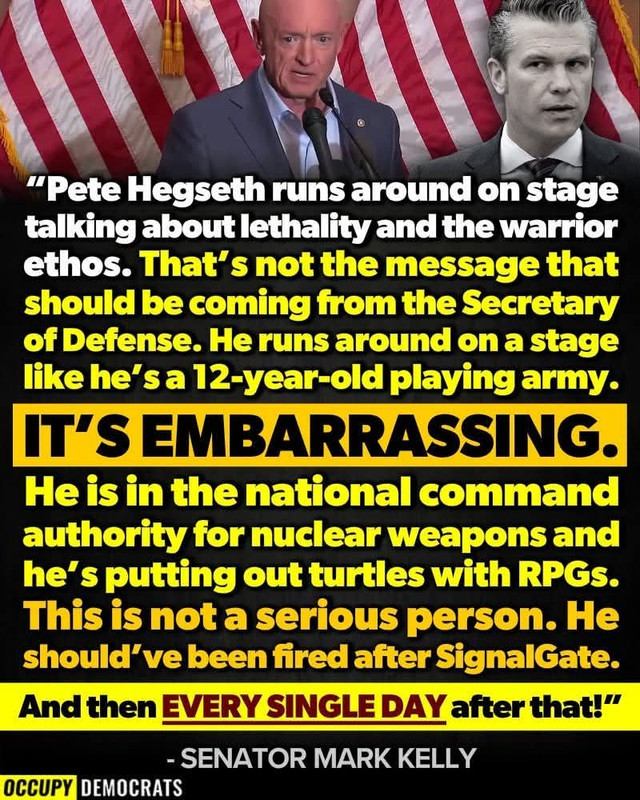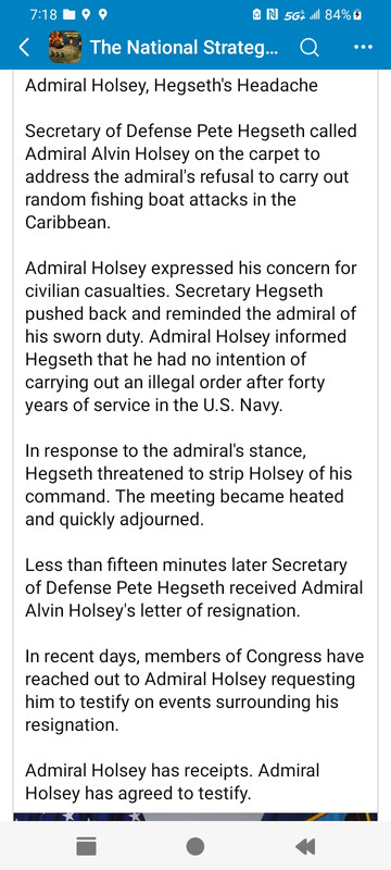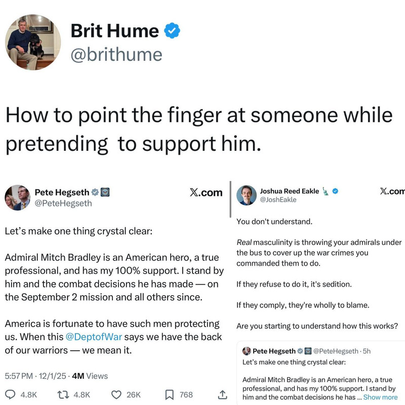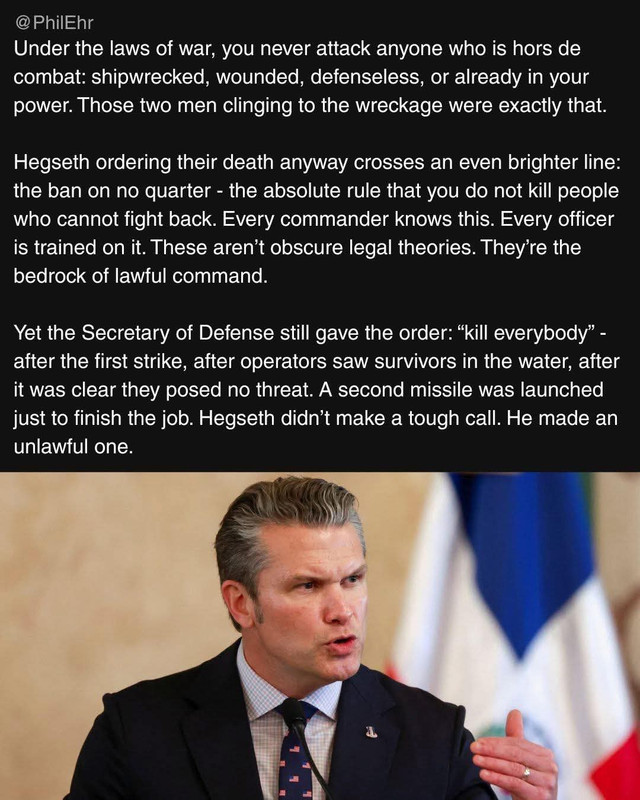 for turtledick and rxwhine: ![]() ![]() From the New York Times: Hegseth Ordered a Lethal Attack but Not the Killing of Survivors, Officials Say