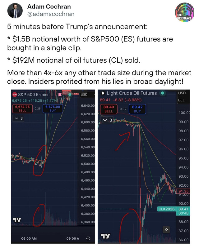 Certainly possible. His blatherings can move the markets significantly. Knowing what he will say certainly can be used to make billions. I’m wondering about the legality of this mess. If someone knows that Apple made 3 billion dollars last quarter instead of the predicted 2 billion, buying Apple is called insider trading. But is ‘General knowledge’, like, we’ve made a deal with Iran to keep Hormuz open, and acting on it, technically ‘insider trading’? Some other criminal event? |