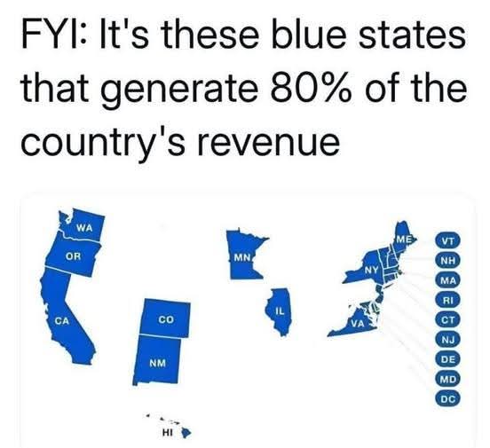 I call this graphic bullsh-t. Exactly what does this graphic consider as revenue? If you go by "Federal tax revenue by state", the above listed blue states generate less that 50% of the "Federal tax revenue" in 2024. SOURCE Prove me wrong. Put up or shut up. |