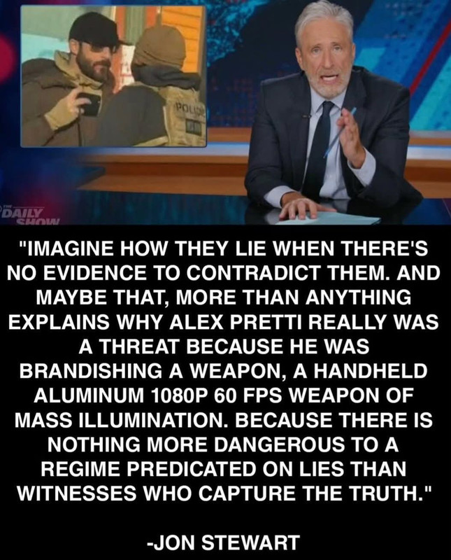| Gandler Member since: Aug 15, 2019 Threads: 30 Posts: 5255 | https://www.cnn.com/2026/01/27/us/alex-pretti-protesters-minneapolis-invs It seems like I may be right once again, Pretti was pulled from his car and had a rib broke by ICE agents a week prior after helping a family be alerted, and was on the list of people they were monitoring. They definitely knew who he was when they rushed across the street to him, and I believe they intended to kill him. The whole thing reeks of a setup. Running across the street, taking his gun, pushing him to the ground, and then yelling "gun gun gun," and then having a statement ready that he was brandishing a gun at officers and a known terrorist. I am not 100% sure yet, but I would say 80% sure this was planned, it certainly was intentional. |