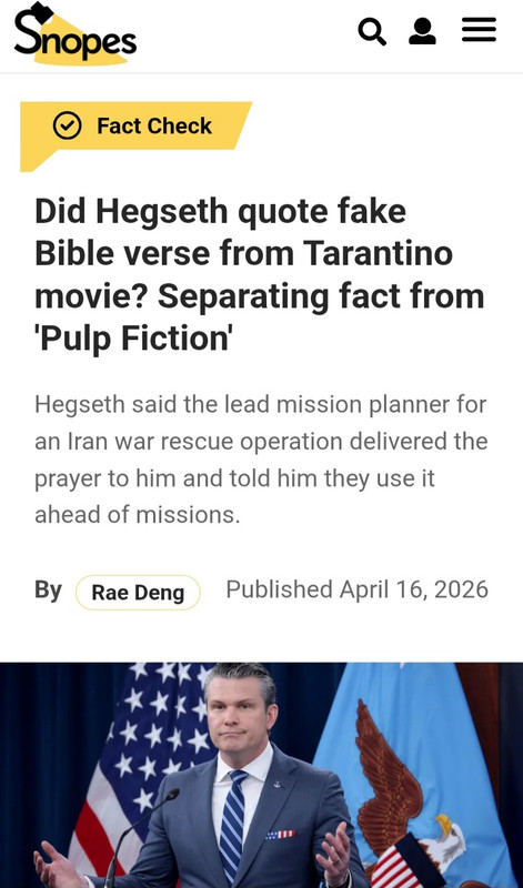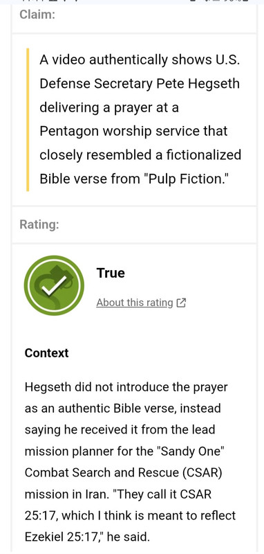 Secretary Hegseth on Wednesday shared a custom prayer, referenced as the CSAR prayer, used by the brave warfighters of Sandy-1 who led the daylight rescue mission of Dude 44 Alpha out of Iran, which was obviously inspired by dialogue in Pulp Fiction. However, both the CSAR prayer and the dialogue in Pulp Fiction were reflections of the verse Ezekiel 25:17, as Secretary Hegseth clearly said in his remarks at the prayer service. Anyone saying the Secretary misquoted Ezekiel 25:17 is peddling fake news and ignorant of reality.