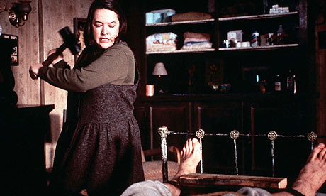 That's an act for sure. She looks like Annie Wilkes, the character in the book, and she calls her Paul Sheldon's number one fan (a line from the book). Paul Sheldon is also a character in the novel, written by Steven King. I don't think the employee is in on the act. He looks like he is being duped. Kathy Bates playing Annie Wilkes in the movie. |