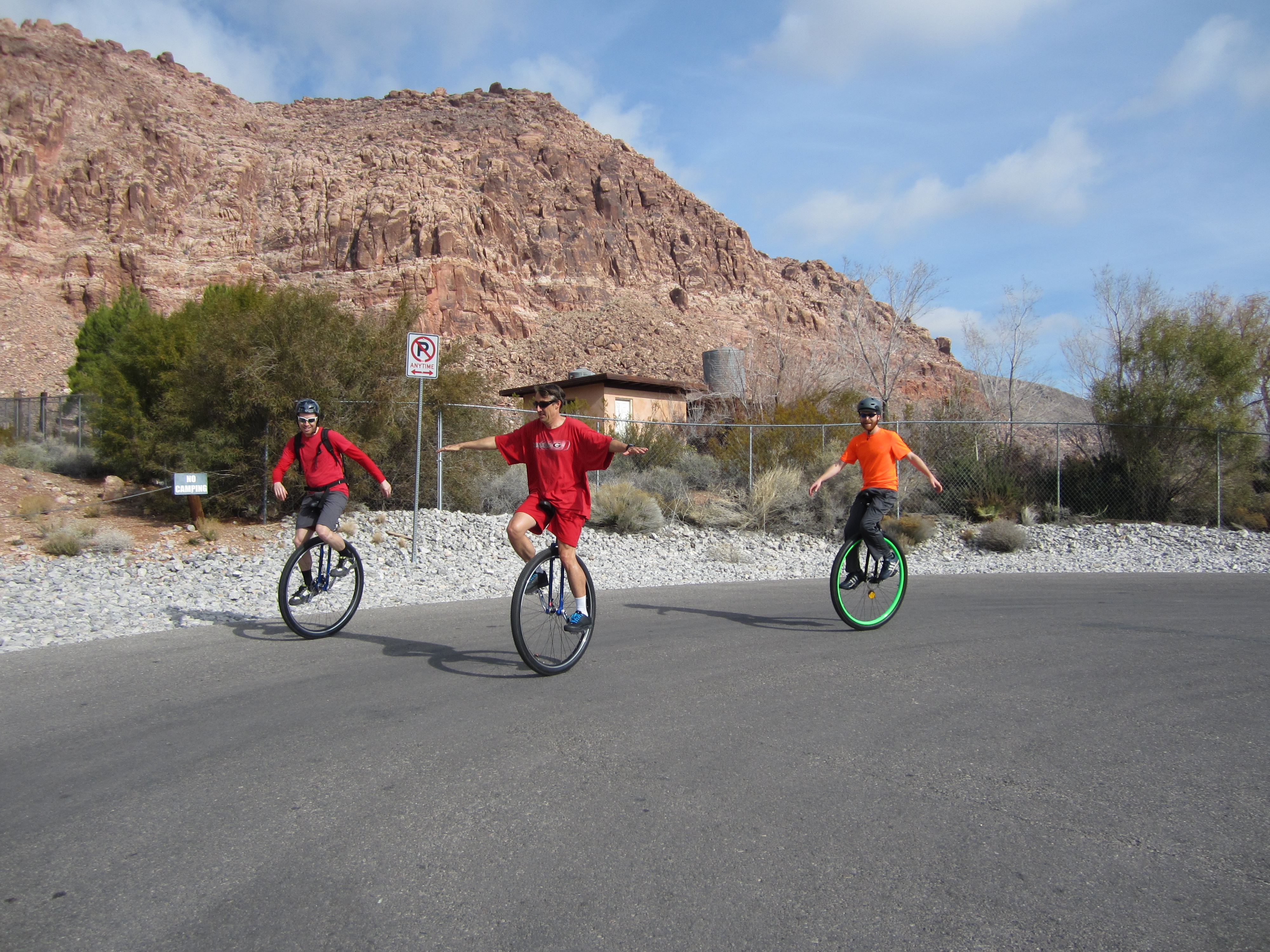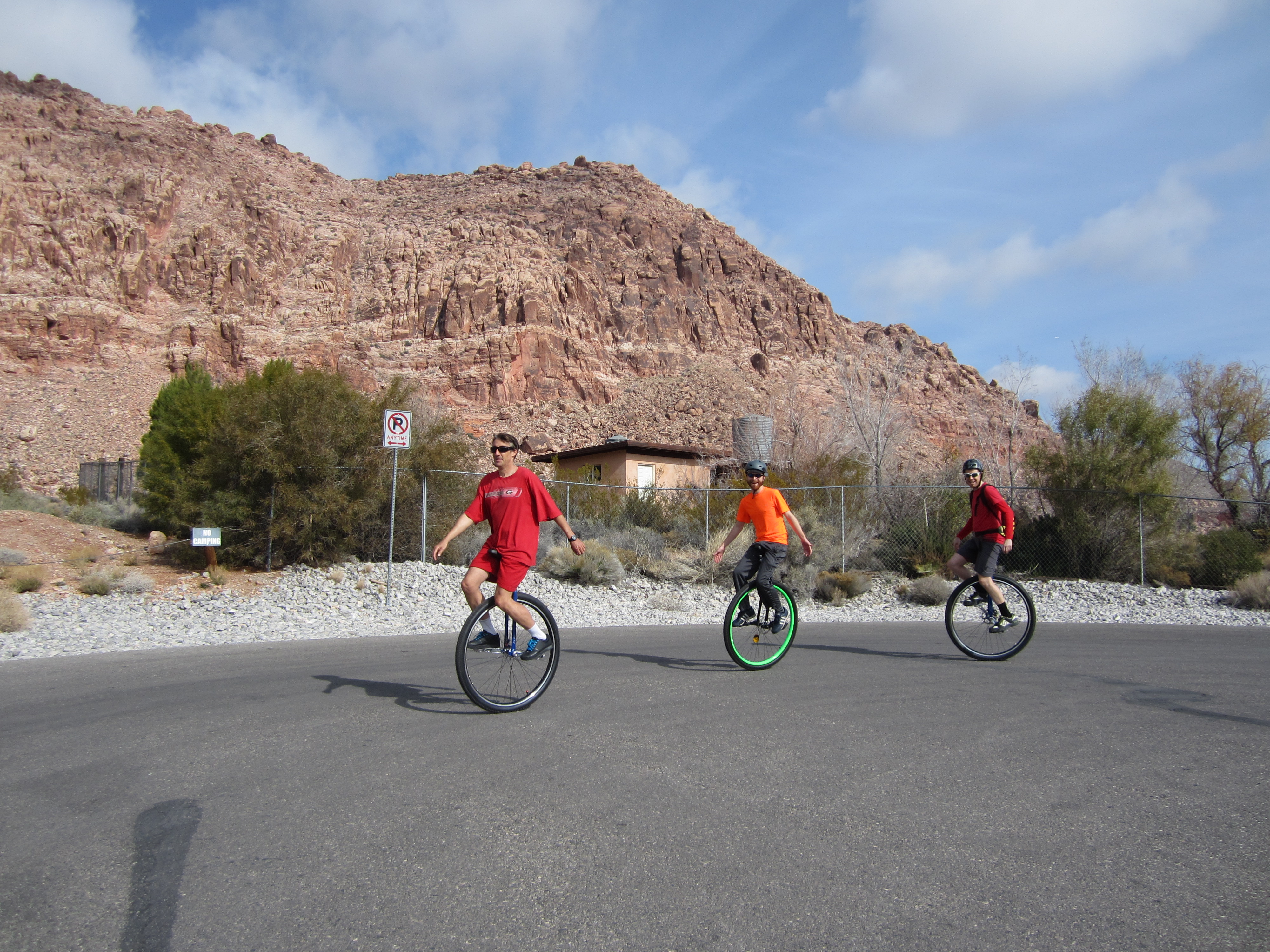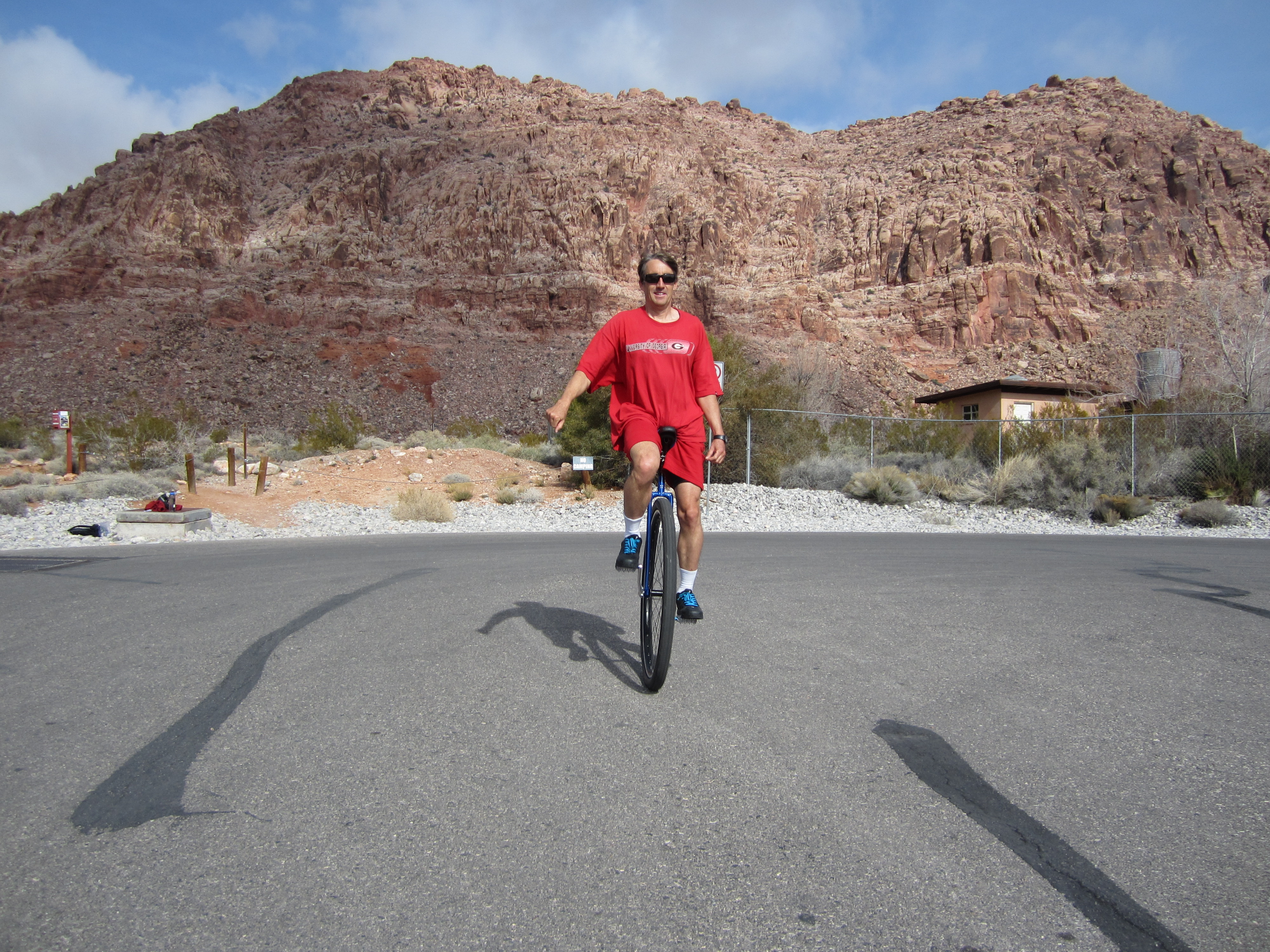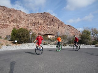 | Wizard Administrator Member since: Oct 23, 2012 Threads: 241 Posts: 6108 | A lot has happened in my unicycle world since I last wrote. I purchased a nice $800 36" unicycle, which I'm enjoying much more than my old heavy Coker. It is now my main unicycle and my 29" is feeling neglected. One day when out on a ride I crossed paths with a biker who said he used to be an avid unicyclist in Arizona but fell out of it when he moved to Vegas. To make a long story short, we've been on about five rides together, including one with another unicyclist friend of his. Both these guys are young strong bucks who are many levels ahead of me. I feel a little bad as the weakest link, but it isn't so bad that they won't ride with me. Both of them applaud my 50-mile challenge and wish to do it with me. That will likely mean doing it here in Vegas, instead of California, but I think I can manage that, although it will be harder, given the hills and street crossings. Here are a couple recent pictures. Click on either for a larger version. ![]() ![]() ![]() I must say that I think my calves are looking good! Knowledge is Good -- Emil Faber |